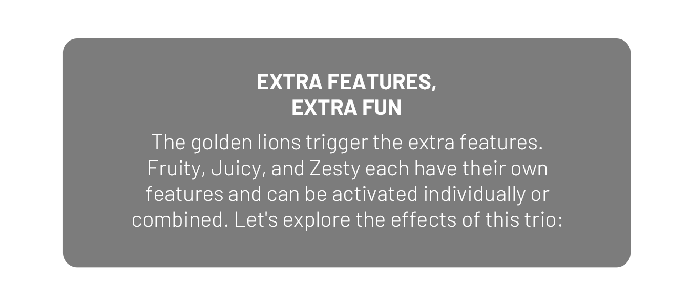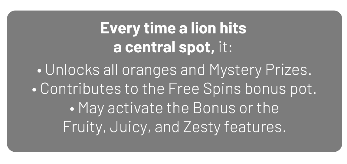 When 2 lions land on the central spots, they double the oranges and Mystery Prizes.