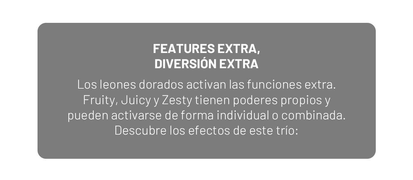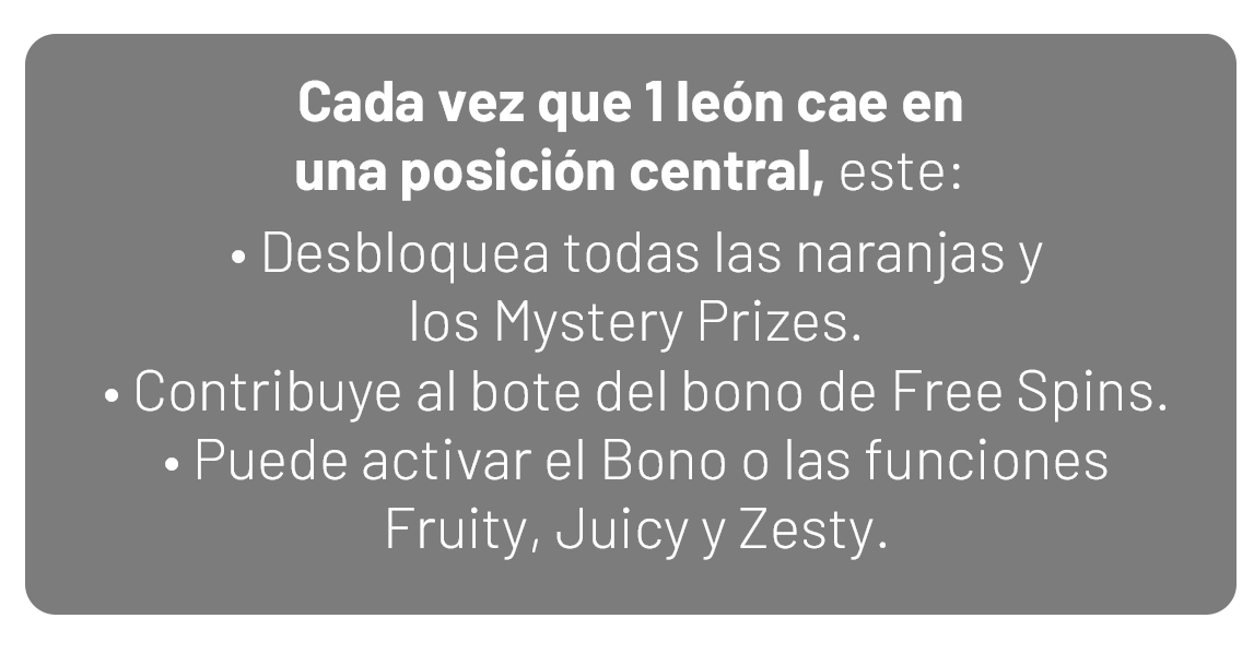 Cuando 2 leones caen en las posiciones centrales, duplican las naranjas y los Mystery Prizes.