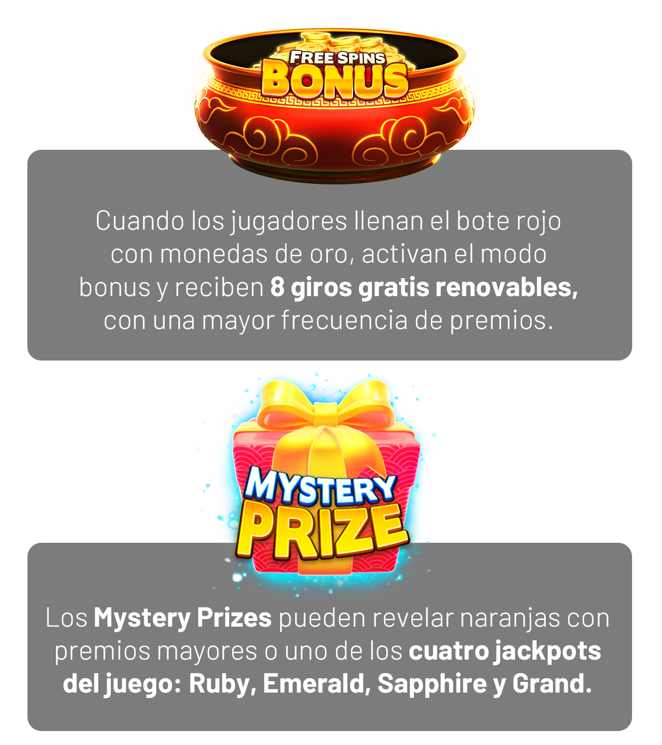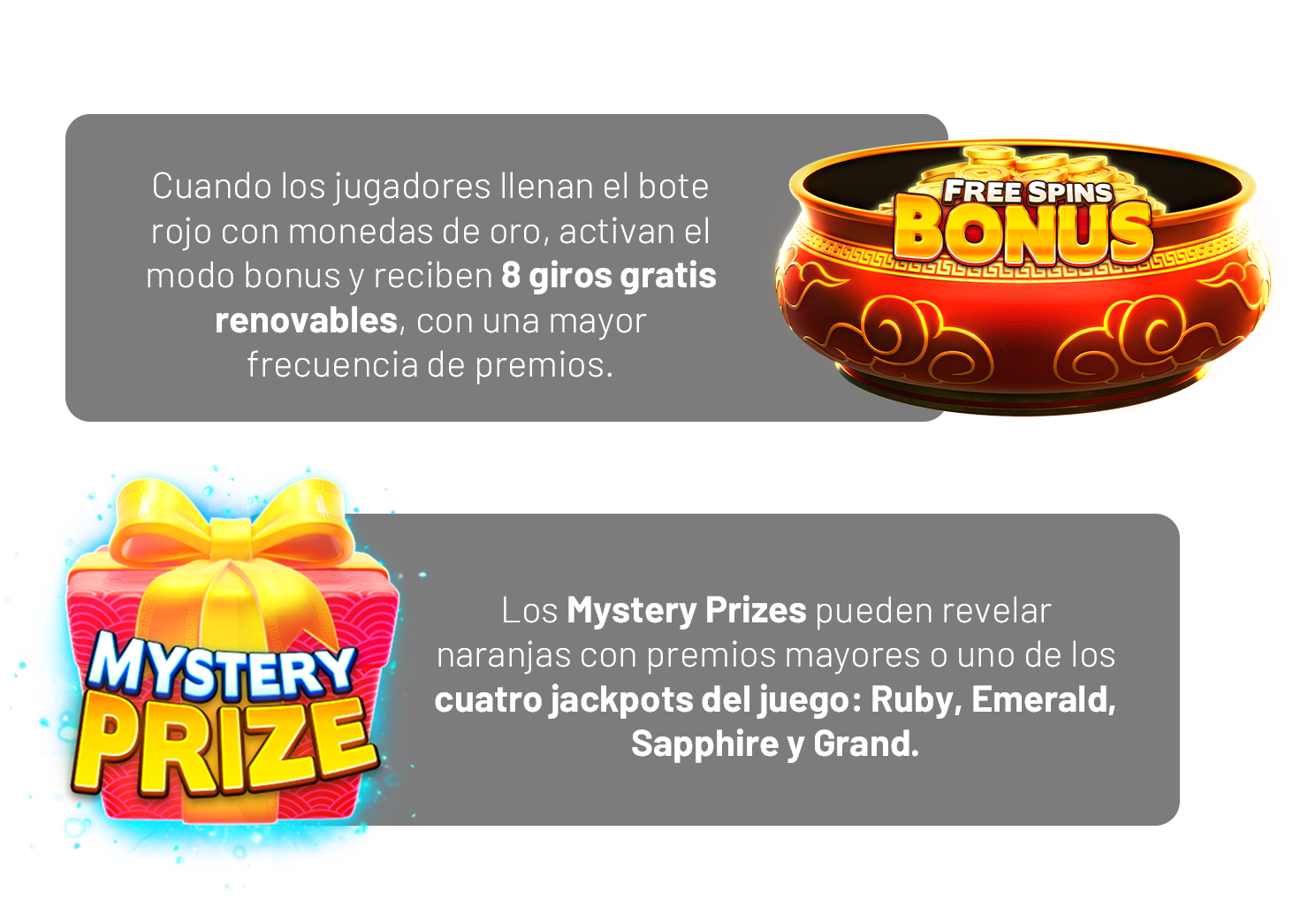 Ofrece un juego con un conjunto de funcionalidades robusto que combina Cash On Reels con Free Spins, Mystery Prizes y tres funciones adicionales para atraer y retener a los jugadores en tu casino.